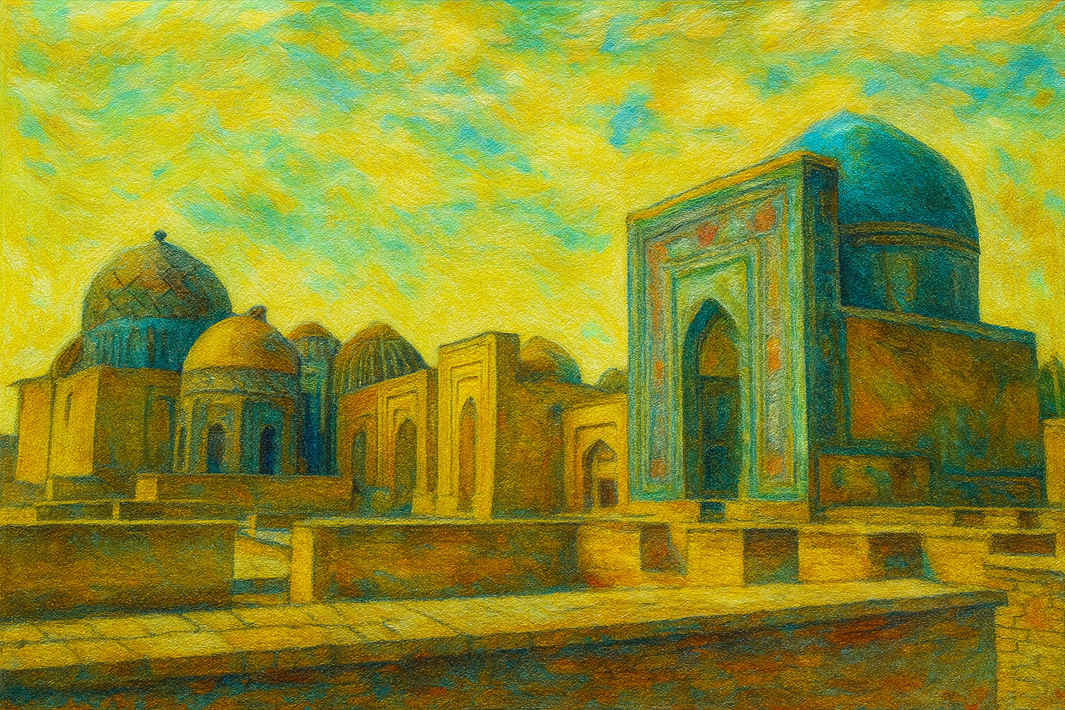 Shah-i-Zinda, meaning “Tomb of the Living King,” is a sacred necropolis in Samarkand honoring Qusam ibn-Abbas, cousin of the Prophet Muhammad. Legend says he entered the afterlife alive, giving the site a powerful spiritual aura. A narrow passageway leads past more than twenty mausoleums, their tiles glowing in shades of turquoise, sapphire, and gold. Built over centuries by Timur’s family and nobles, each tomb is unique, yet together they form a stunning corridor of devotion. Pilgrims still walk here in quiet awe.