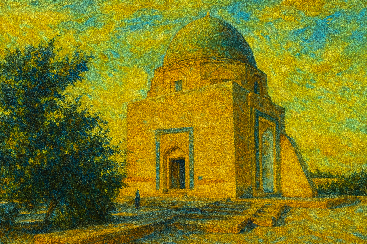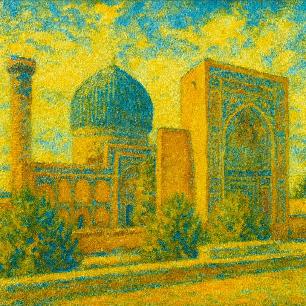 Gur-e-Amir, crowned with a turquoise dome, is the resting place of Amir Timur in Samarkand. Built in 1403 for his grandson, it later became Timur’s own tomb. Inside, mosaics, marble, and his jade tombstone create a solemn beauty. Legend says disturbing the grave brings disaster, echoed when it was opened in 1941 just before Hitler invaded. Also buried here is Ulugh Beg, Timur’s scholar-king grandson.